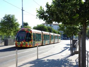 - La rame 2095 Citadis 402 Alstom, opérant sur la ligne 2, vient de quitter la station « Rives du Lez », propre à la ligne 3, le lundi 8 août 2016. Copyright : Anje34