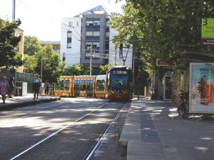 - Les rames 2059 et 2054 Citadis 302 Alstom, opérant sur la ligne 2, sont photographiées rue Jules-Ferry à Montpellier, à la station provisoire « Gare Saint-Roch » dotée de quais en dur mais dépourvus de mobilier et de distributeurs de titres de transport, le mardi 2 août 2016. Copyright : Louis Ferdinand
