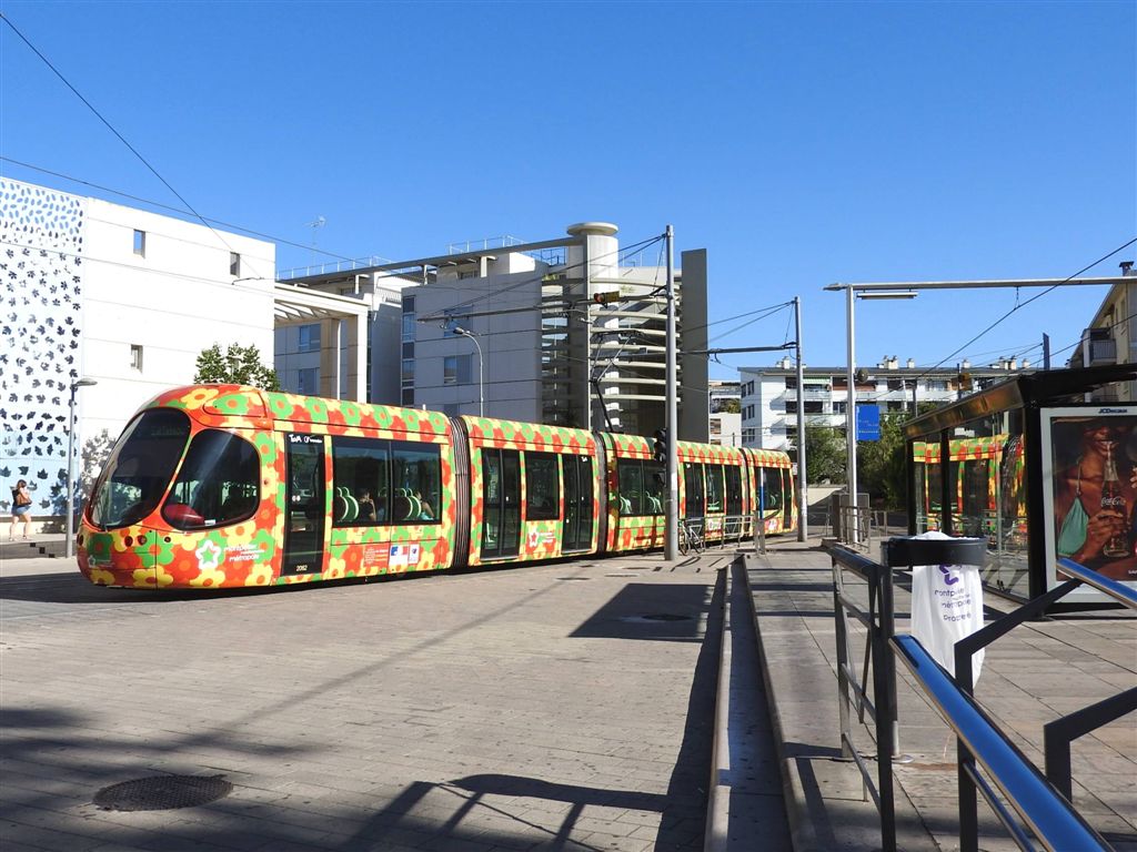 La rame 2062 Citadis 302 Alstom, opérant sur la ligne 2, vient de quitter le tronc commun lignes 1 et 4 à l’approche de la station « Rives du Lez », propre à la ligne 3, le lundi 8 août 2016. Copyright : Anje34
