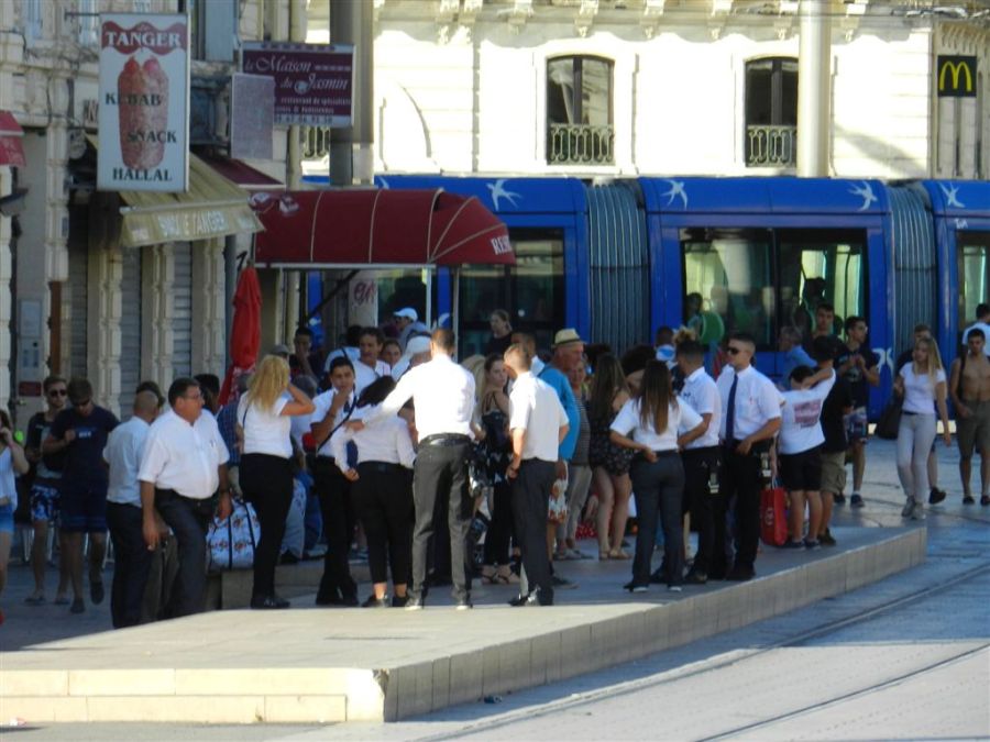 Une meute de contrôleurs est photographiée à la station provisoire « Gare Saint-Roch », quai direction « Saint Jean de Védas – Centre », rue Jules-Ferry à Montpellier, le mercredi 10 août 2016. Il faut bien rattraper le loupé de la nouvelle grille tarifaire, qui aurait dû être appliquée dès le lundi 1er août 2016. Copyright : Anje34