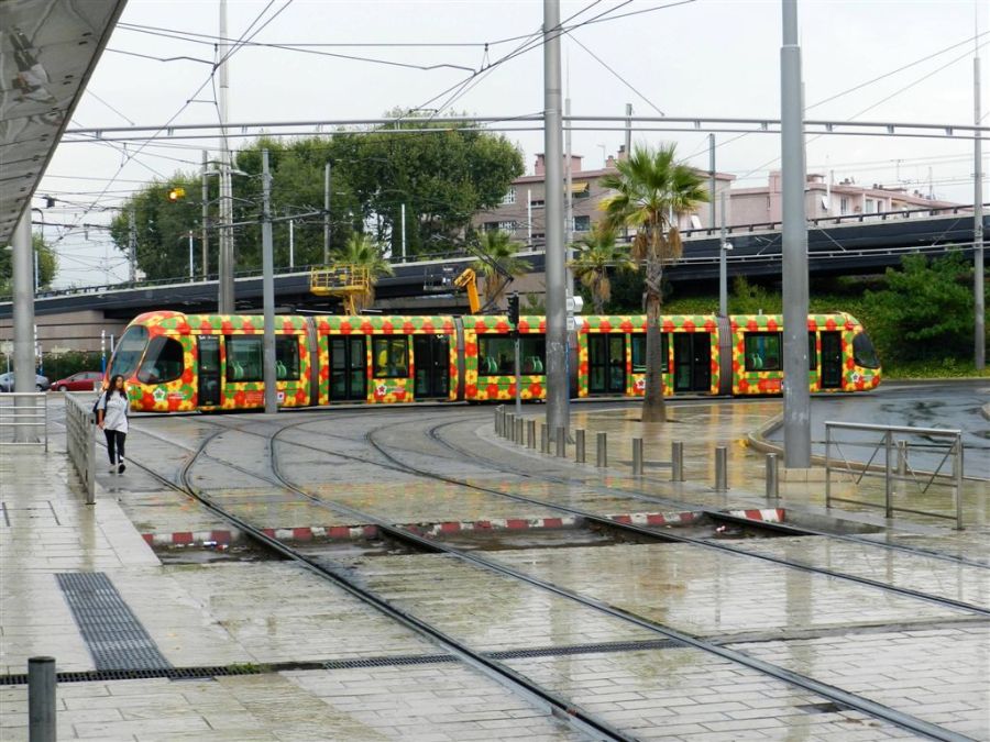 Une rame Citadis 302 Alstom est photographiée sur la place du 11 Novembre alors qu’elle prend la direction de la station « Comédie », via la galerie des tags de Montpellier, le mardi 16 août 2016. Copyright : Anje34