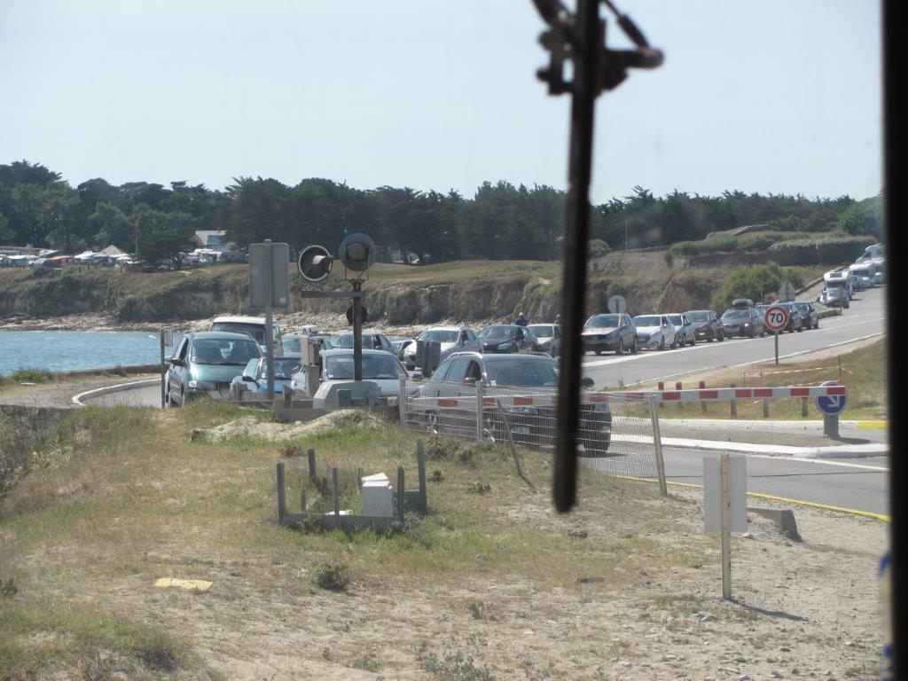 Bouchon de véhicules automobiles au passage à niveau de l’isthme de Penthièvre, photographié depuis le train « Le Tire-Bouchon » Auray-Quiberon, le dimanche 14 août 2016 à 13h05. Copyright : Edouard Paris