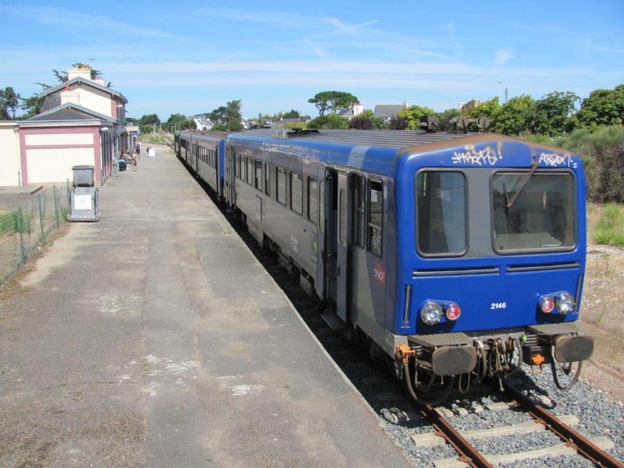 Composition classique du Tire-Bouchon en gare de Quiberon, soit deux autorails X 2100 encadrant deux remorques XR 6100, photographiée le dimanche 14 août 2016. Copyright : Edouard Paris