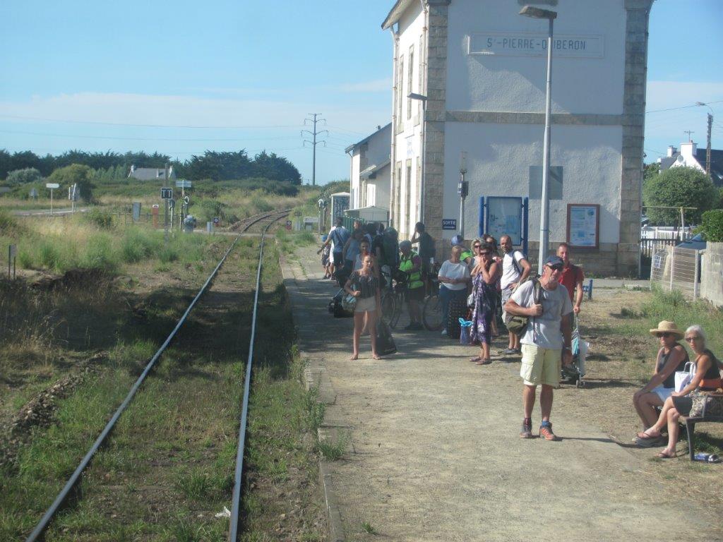 Voyageurs photographiés sur le quai de la halte de St-Pierre-Quiberon à l’arrivée du Tire-Bouchon déjà bondé, le dimanche 14 août 2016 à 17h39. Copyright : Edouard Paris