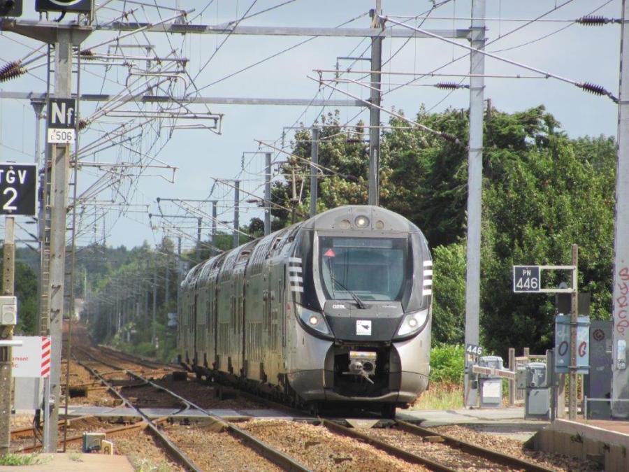 La gare d’Auray est desservie par des TER Bretagne et des TER Pays de la Loire. Sur la photo, prise le samedi 20 août 2016 depuis un quai de la gare d’Auray, une rame Regio 2N Bombardier TER Bretagne. Copyright : Edouard Paris
