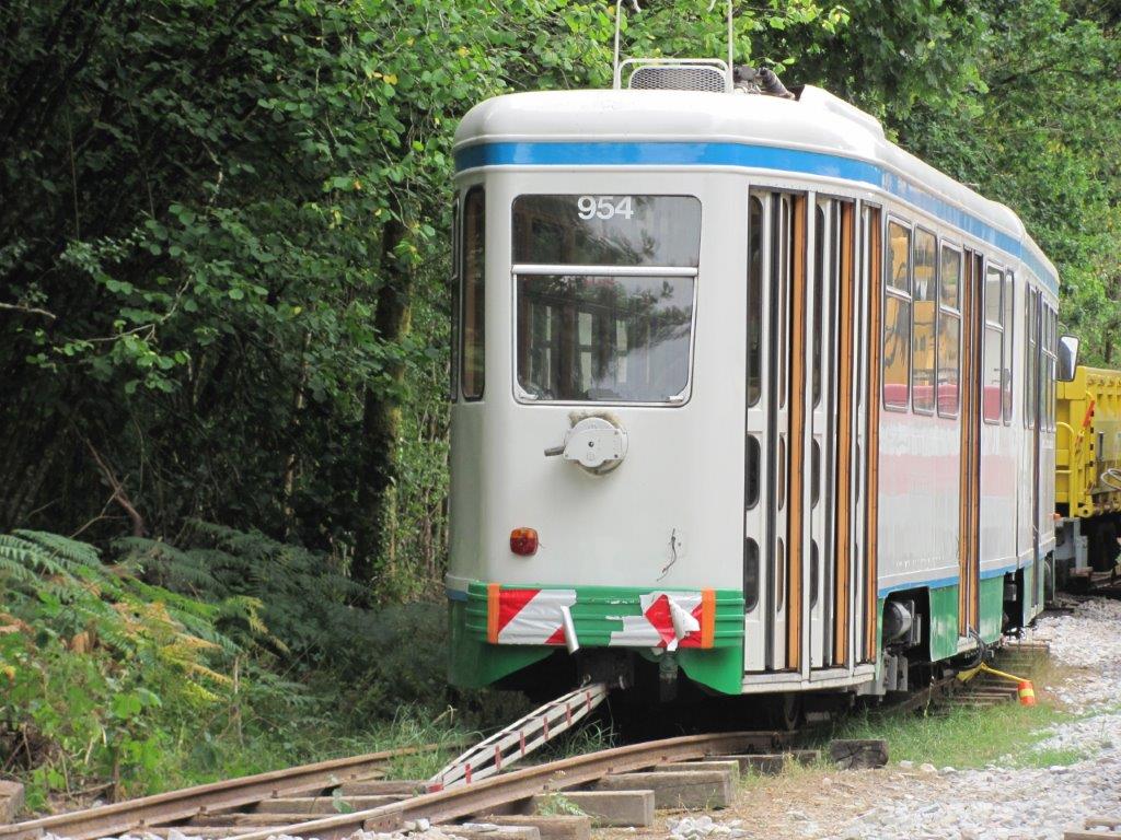 Vue sur la caisse arrière de la motrice PCC articulée stéphanoise numérotée 954, en gare de Bon Repos (Côtes d’Armor), le mercredi 17 août 2016. La perche de captage du courant délivré par la ligne aérienne de contact était située sur le toit de cette caisse arrière. Copyright : Edouard Paris