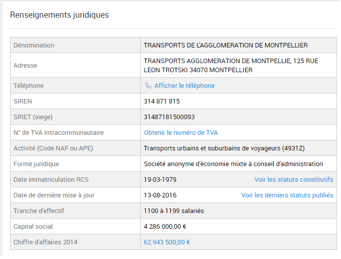 Renseignements juridiques de la SAEML TaM en ligne sur societe.com, le mercredi 31 août 2016.
