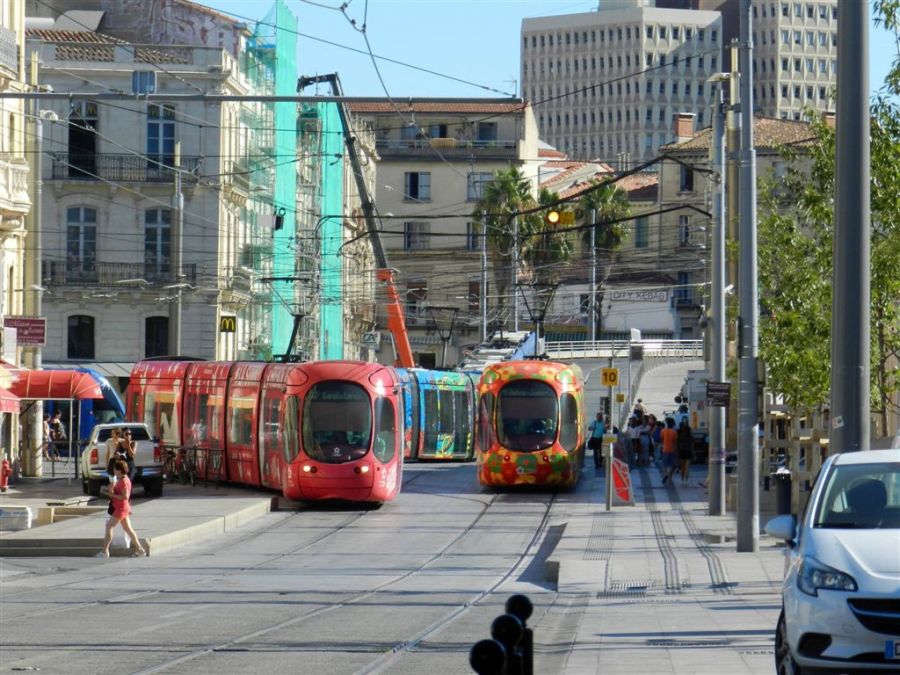 Sur la photo prise place Auguste-Gibert à Montpellier, le lundi 5 septembre 2016 en milieu de matinée, la rame 2048 Citadis Alstom « La Sunny French Tech Attitude » opérant sur la ligne 4, une rame fleurie Citadis 302 de la ligne 2, une caisse et un soufflet d’une rame Citadis 402 Alstom de la ligne 3 et une cabine d’une rame Citadis 401 Alstom à gauche. On devine la présence d’une cinquième rame, opérant sur la ligne 1, sur le haut de la rue Jules-Ferry. Copyright : Anje34