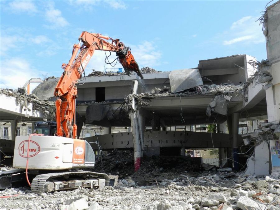 Place Alexandre-Laissac à Montpellier, l’engin de chantier procède au grignotage du béton armé au moyen d’une pince idoine, le jeudi 18 août 2016. Copyright : Anje34
