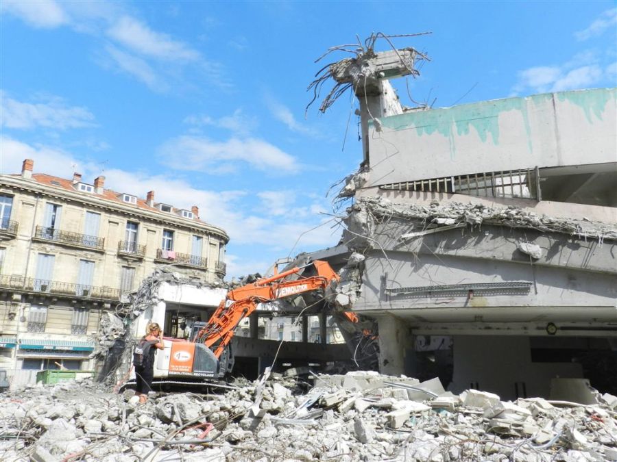 Un engin de chantier de démolition des halles Alexandre-Laissac en pleine action face à l’objectif d’une photographe intrépide, le jeudi 18 août 2016. Copyright : Anje34