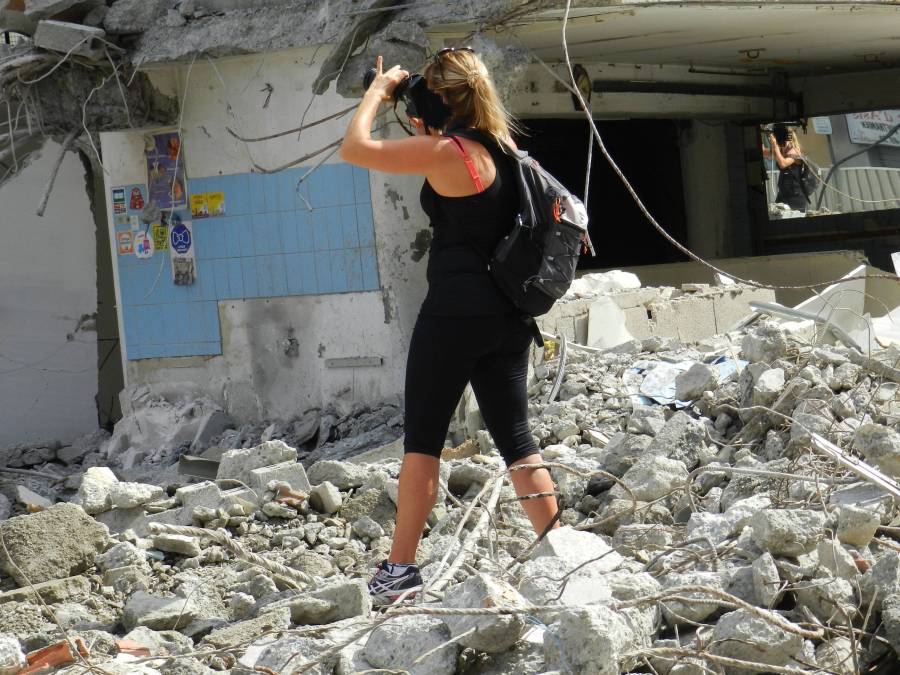 La photographe intrépide en plein reportage photo au milieu des gravats des halles Alexandre-Laissac à Montpellier, le jeudi 18 août 2016. Copyright : Anje34