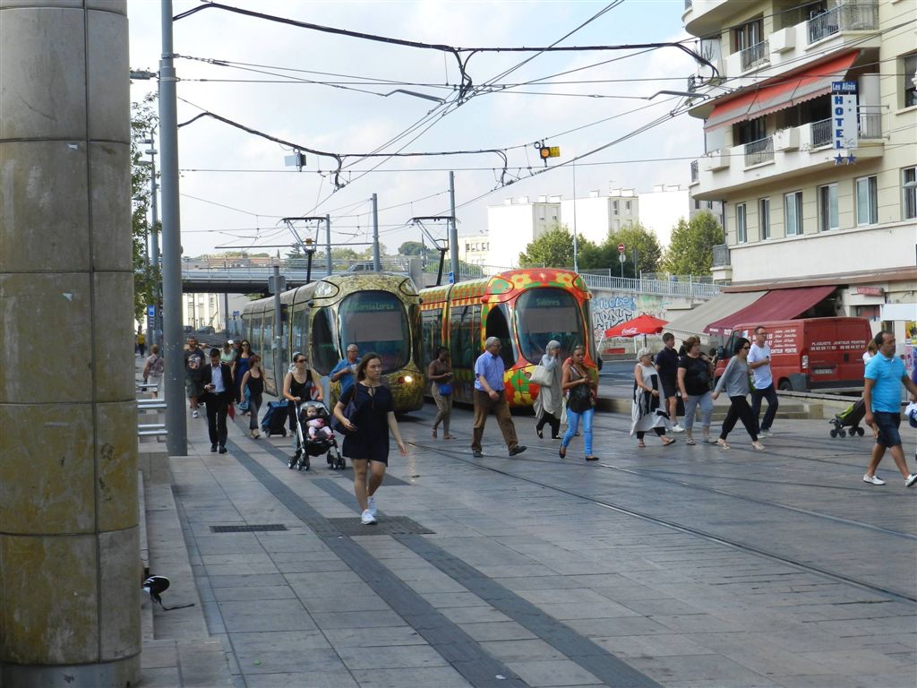 Contrairement à ce que certains peuvent espérer, la plus grande majorité des personnes viennent de sortir de la gare Saint-Roch et non pas de la rame Citadis 302 Alstom opérant sur ligne 4, sens 4a, le mardi 13 septembre 2016, en fin de matinée. Copyright : Anje34