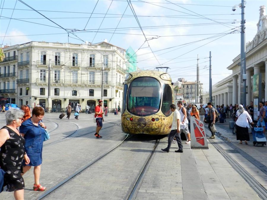 La même rame Citadis 302 Alstom part à vide en direction de la rue du Pont-de-Lattes, le mardi 13 septembre 2016, en fin de matinée. Copyright : Anje34