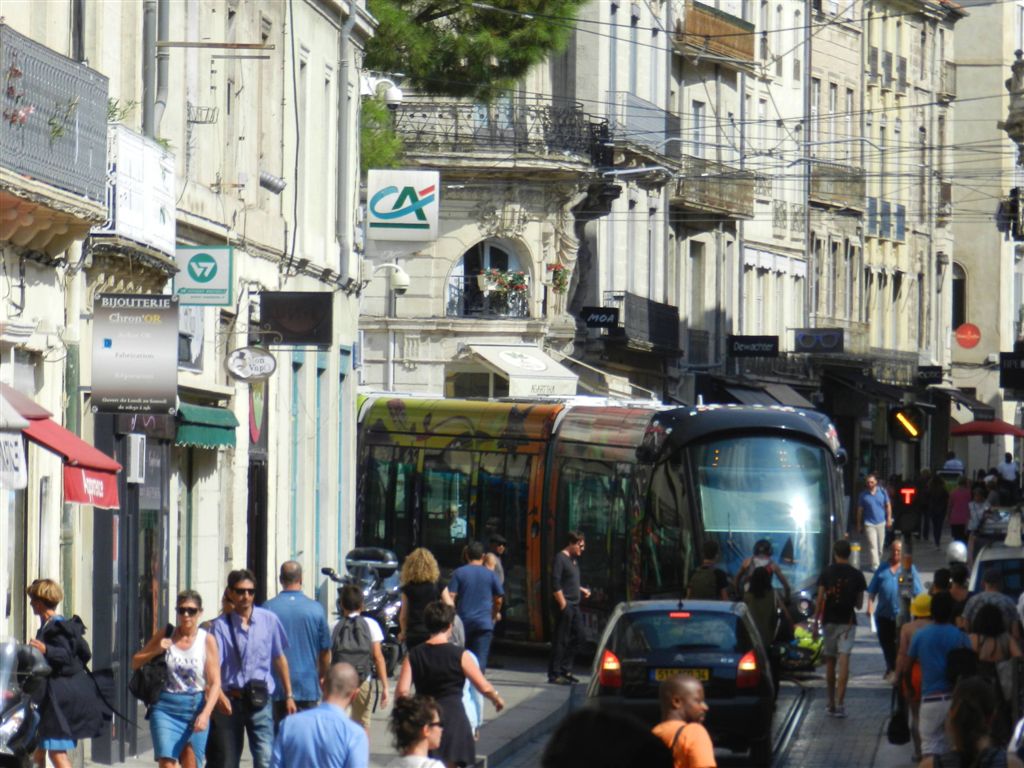 Le mardi 13 septembre 2016, en fin de matinée, une rame Citadis 402 Alstom de la ligne 3 quitte la rue du Faubourg-de-la-Saunerie en direction du boulevard du Jeu-de-Paume et non pas vers le boulevard de l’Observatoire, à la suite de l’activation du plan vigipirate à la hauteur de la station « Gare Saint-Roch », rue de la République à Montpellier. Copyright : Anje34