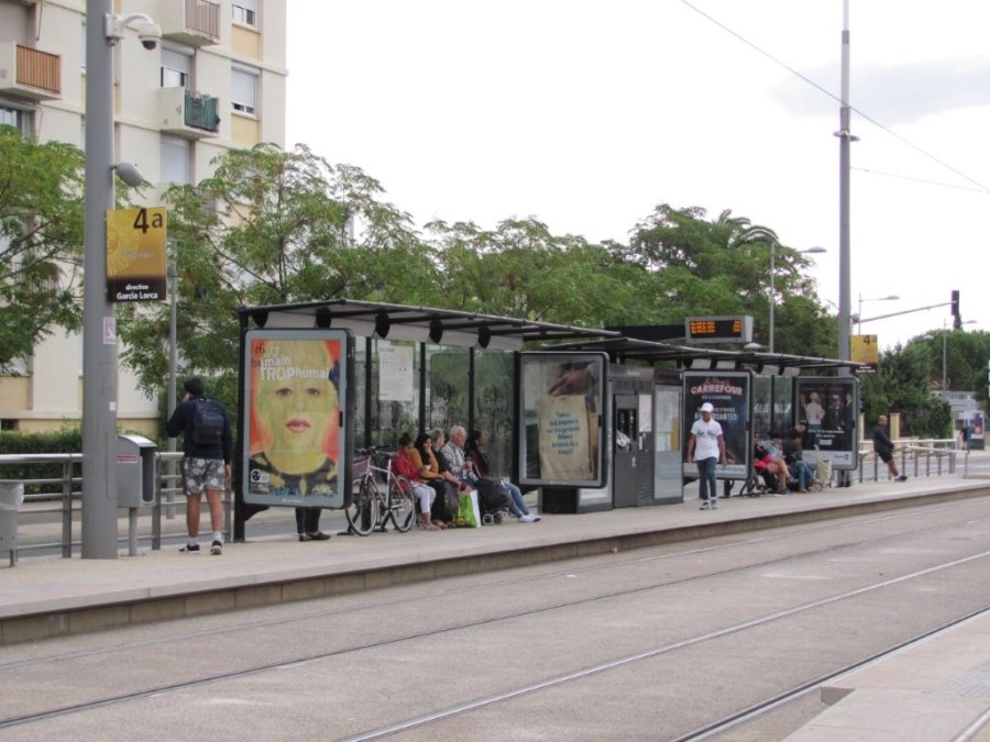 Sur la ligne 4 de tramway bouclée, la fréquentation de la station « Restanque », avenue des Près-d’Arènes à Montpellier, est tirée par le magasin Lidl de la rue de l’Industrie. Photo prise le samedi 17 septembre 2016 à 10h19. Copyright : Edouard Paris