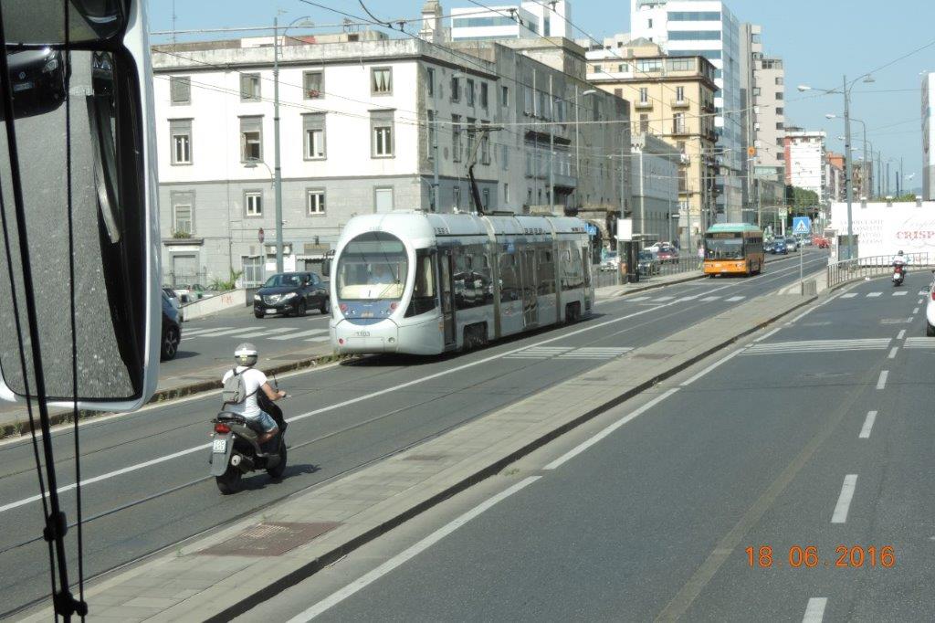 A Naples, la rame 1103 Sirio AnsaldoBreda (année 2004) est photographiée au moment où elle quitte l’arrêt « Marina Carmine », commune aux lignes 1 et 4, en direction du terminus « Stazione Marittima (via Cristoforo Colombo) », le samedi 18 juin 2016. Copyright : Fab