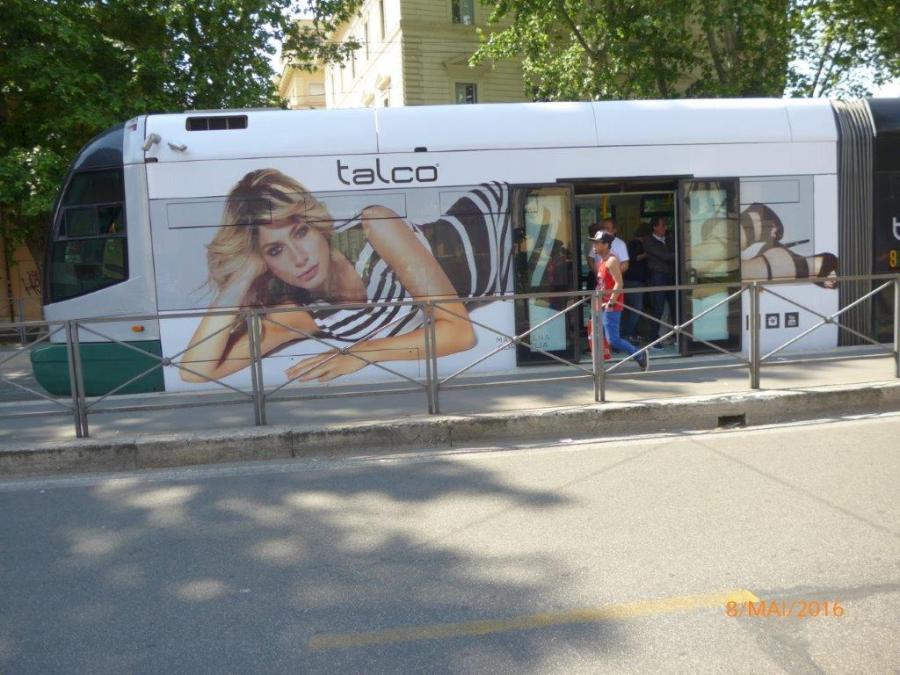 Aperçu d’une partie d’une rame de la série 9100 Cityway I Fiat Ferroviaria photographiée à la station « Belli » sur la ligne 8 du réseau de tramways de Rome, le dimanche 8 mai 2016. Copyright : Laure C