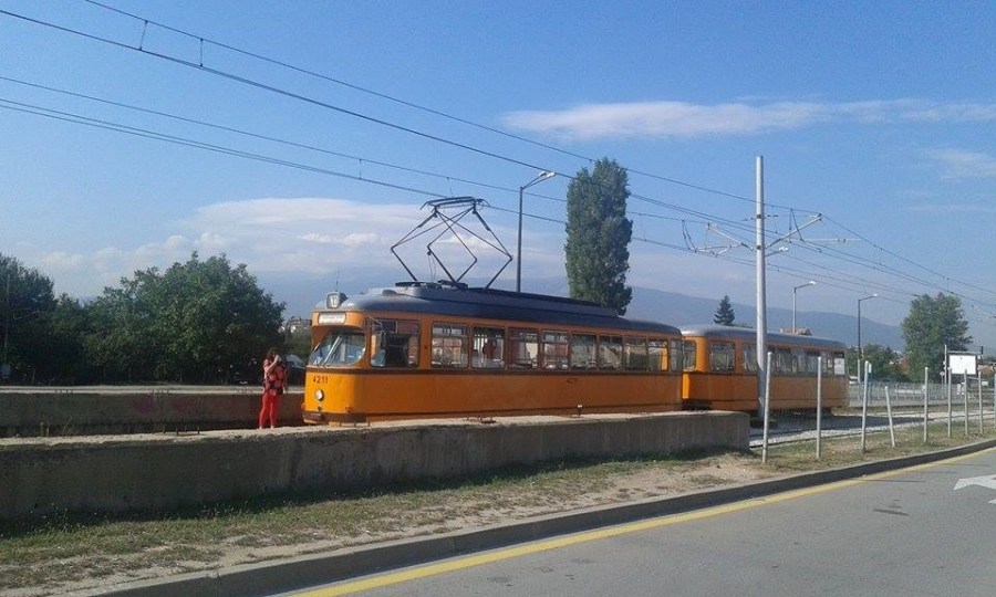 La motrice 4211 T4 Düwag (année 1960) et sa remorque B4 sont photographiées au terminus « Gare routière de l’Est » de la ligne 22 à voie normale (1 435 mm) à Sofia, la capitale bulgare, le lundi 29 août 2016. Copyright : Alexia Botrel