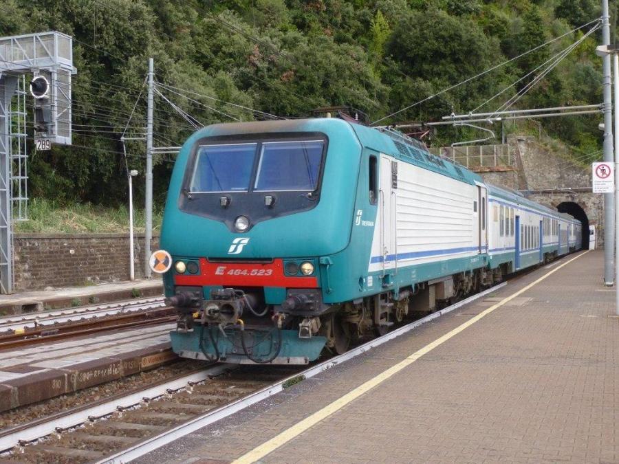 Un train de voyageurs, locomotive électrique monocabine E 464.523 en tête, entre en gare de Monterosso al Mare, le mercredi 21 septembre 2016. Copyright : Michel Bozzola