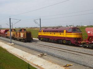- La CC 5215 (année 1955) ex SNCB, appartenant à une association belge de préservation du patrimoine ferroviaire, numérotée 1605 et revêtant les couleurs des chemins de fer luxembourgeois, est photographiée en pousse d’un train de ballast sur le contournement ferroviaire de Nîmes et Montpellier (CNM), entre Manduel et Garons, quelques secondes après avoir croisé un second train de ballast poussé par deux locomotives diesel allemandes V-100 de la société Colas Rail, le lundi 14 mars 2016. Copyright : Michel Bozzola