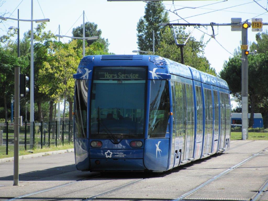La rame 2007 Citadis 401 Alstom est photographiée sur une des deux voies en tiroir du terminus « Odysseum » de la ligne 1, le dimanche 9 octobre 2016, dans le prolongement desquelles se ferait l’extension de la ligne 1 vers la gare TGV Montpellier Sud de France à l’horizon 2020, si cette solution est retenue. Copyright : Edouard Paris