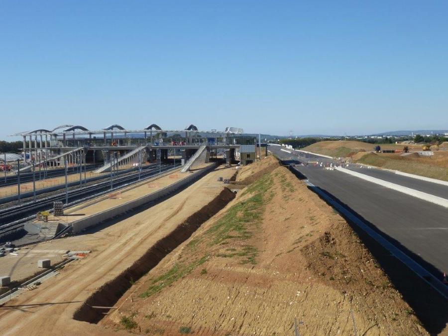 A gauche la future gare TGV Montpellier Sud de France et à droite la future autoroute A9 déplacée, photographiées le dimanche 9 octobre 2016. Copyright : Michel Bozzola