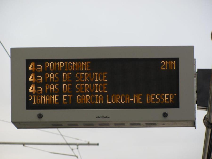 Photographie du panneau électronique d’information du quai 4a du terminus « Garcia Lorca », le dimanche 16 octobre 2016 à 10h22. Copyright : Edouard Paris