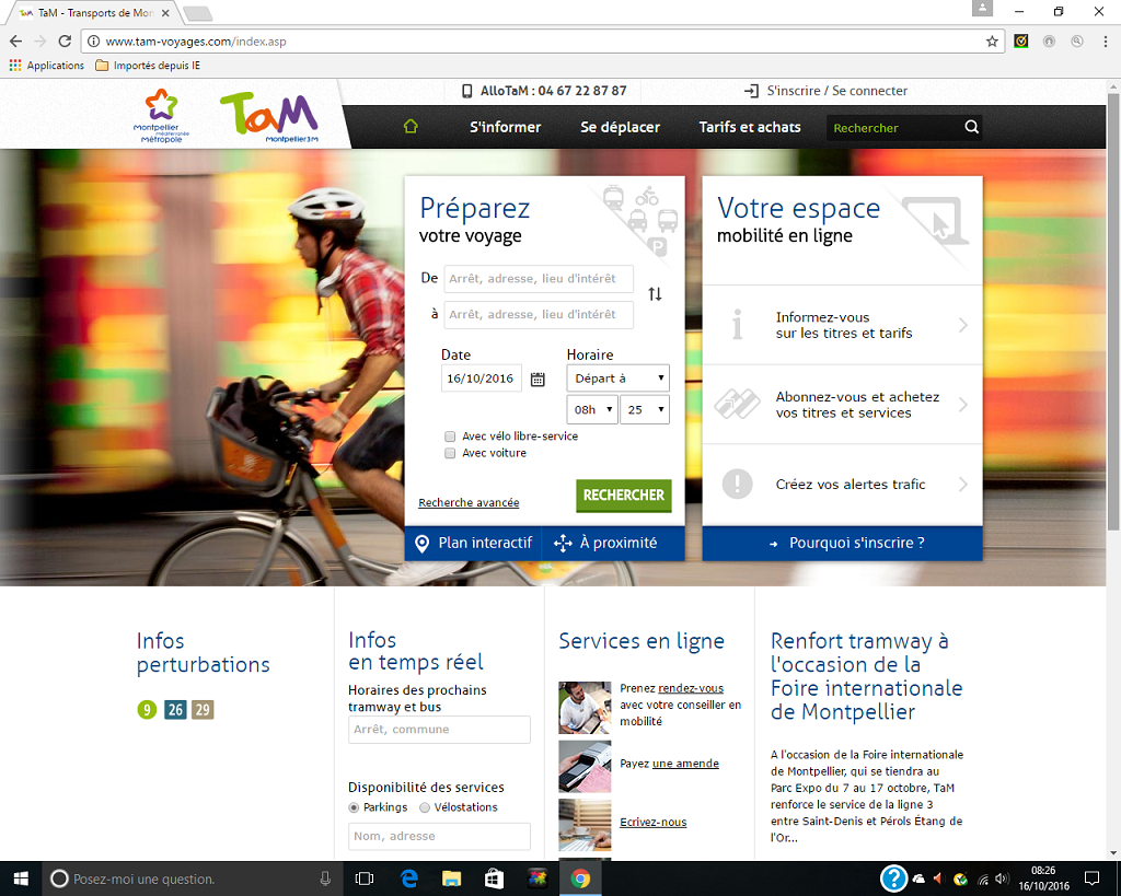 Capture d’écran de la page d’accueil du site tam-voyages.com réalisée à 8h26, le dimanche 16 octobre 2016, par Edouard Paris