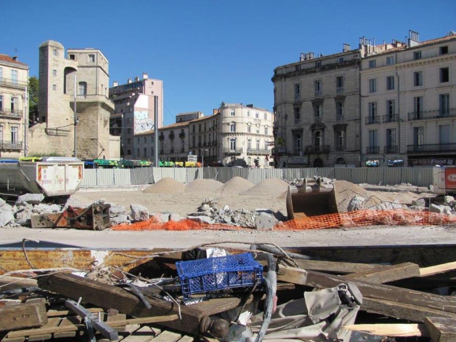 Travaux de comblement du Trou des Halles de Montpellier, place Alexandre-Laissac, situation au dimanche 9 octobre 2016. Copyright : Edouard Paris