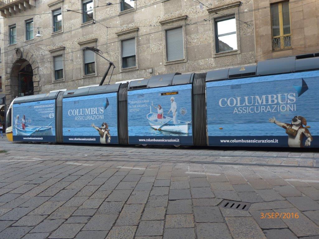 Via Orefici à Milan, livrée publicitaire intégrale appliquée sur la rame 7520 (année 2008) Sirio AnsaldoBreda de type 7500, le samedi 3 septembre 2016. Copyright : Laure C