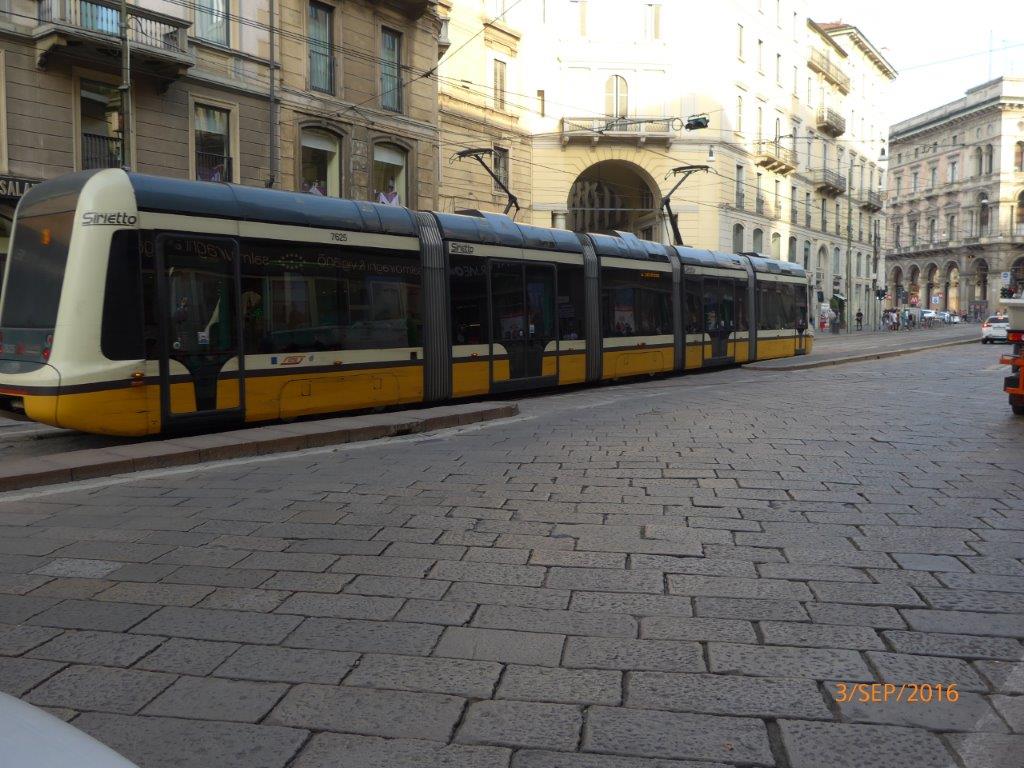 Via Orefici à Milan, livrée classique d’une rame Sirio AnsaldoBreda de type 7600, ici la 7625 (année 2009), le samedi 3 septembre 2016, au moment où cette dernière croise la rame 7520 Sirio AnsaldoBreda, toutes deux opérant sur la ligne 14. Copyright : Laure C