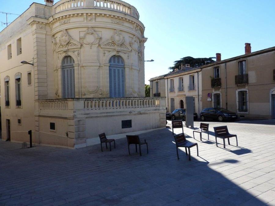 Des chaises installées place Giral à Montpellier, au débouché des rues Montcalm, à gauche, et de la Merci, à droite, photographiées le mardi 18 octobre deux mille cheize. Copyright : Anje34