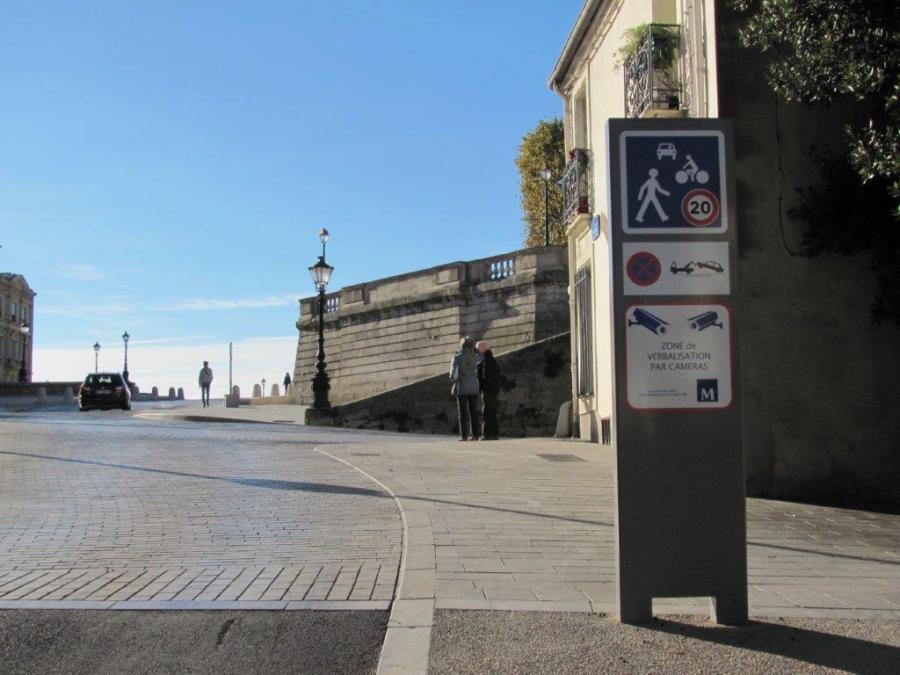 Signalisation installée tout en haut de la rue Barthez à Montpellier, informant l’automobiliste de son entrée dans une zone où la vidéo-verbalisation est opérationnelle. Photo prise le samedi 22 octobre 2016. Copyright : Edouard Paris