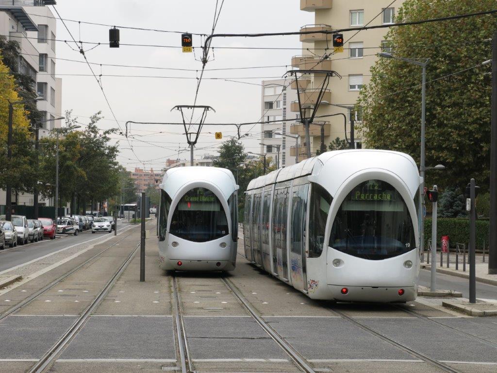 A Lyon, au bout du boulevard Jean XXIII, près de Grange Blanche, un ver à soie standard fait une pause alors qu’un second de même espèce file vers Perrache, le lundi 17 octobre 2016. Copyright : Edgar Chaptal