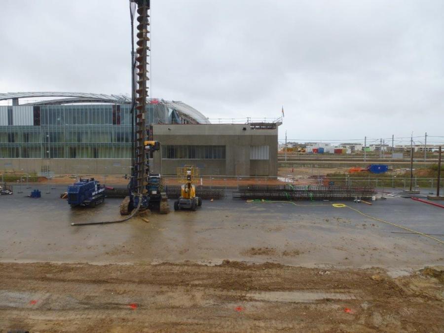Au pied de la future gare TGV Montpellier Sud de France, côté nord-ouest, la construction d’un ouvrage d’art au-dessus de la nouvelle autoroute A9 se déroule à même la chaussée de cette même autoroute. Photo prise le dimanche 23 octobre 2016. Copyright : Michel Bozzola