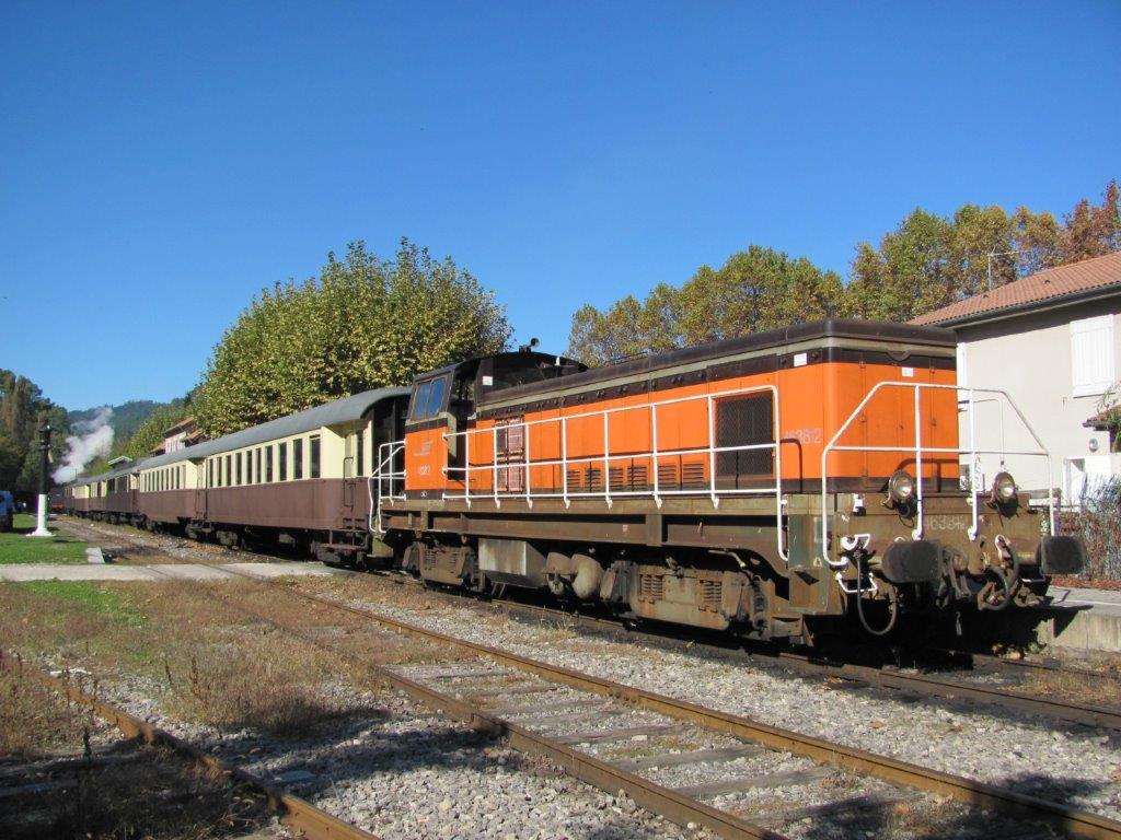 En gare de Saint-Jean-du-Gard, la locomotive BB 63812 Brissonneau et Lotz vient d’ajouter deux voitures supplémentaires en tête du Train à Vapeur des Cévennes, le dimanche 30 octobre 2016. Copyright : Edouard Paris