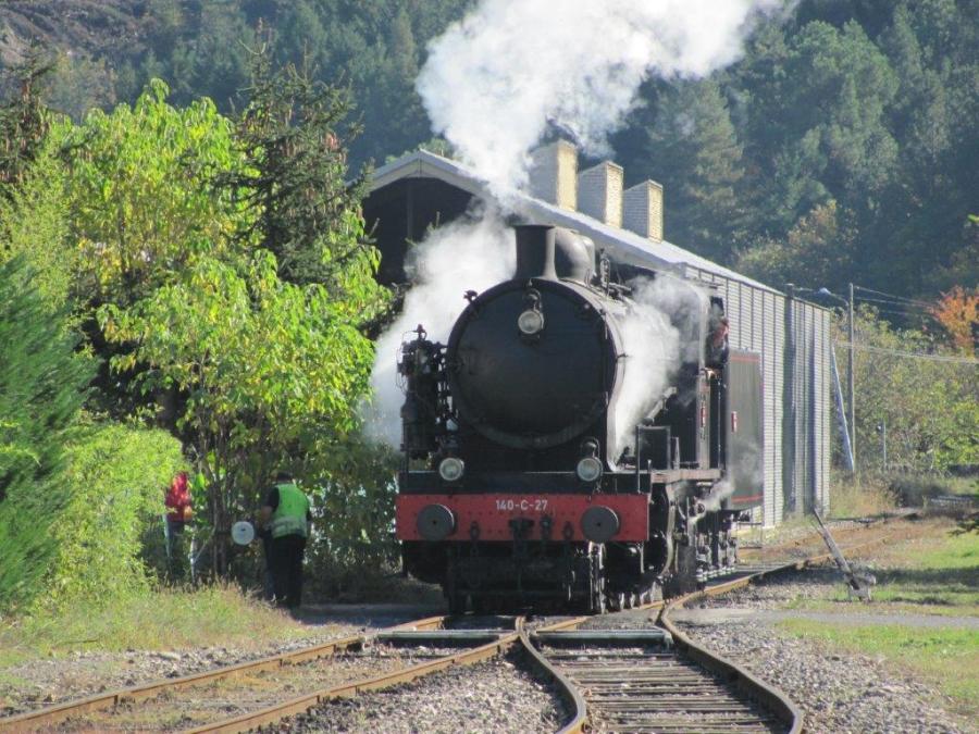 A Saint-Jean-du-Gard, la locomotive 140 C 27 manœuvre pour venir se mettre en tête du Train à Vapeur des Cévennes, le dimanche 30 octobre 2016. Copyright : Edouard Paris