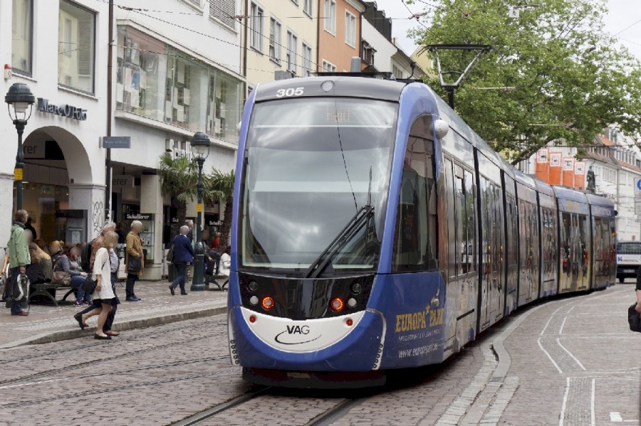 La rame 305 Urbos 3 CAF, opérant sur la ligne 3, est photographiée sur Kaiser-Joseph-Strasse à Freiburg im Breisgau, en direction de Haid, le jeudi 16 juin 2016. Copyright : Yvon Brument