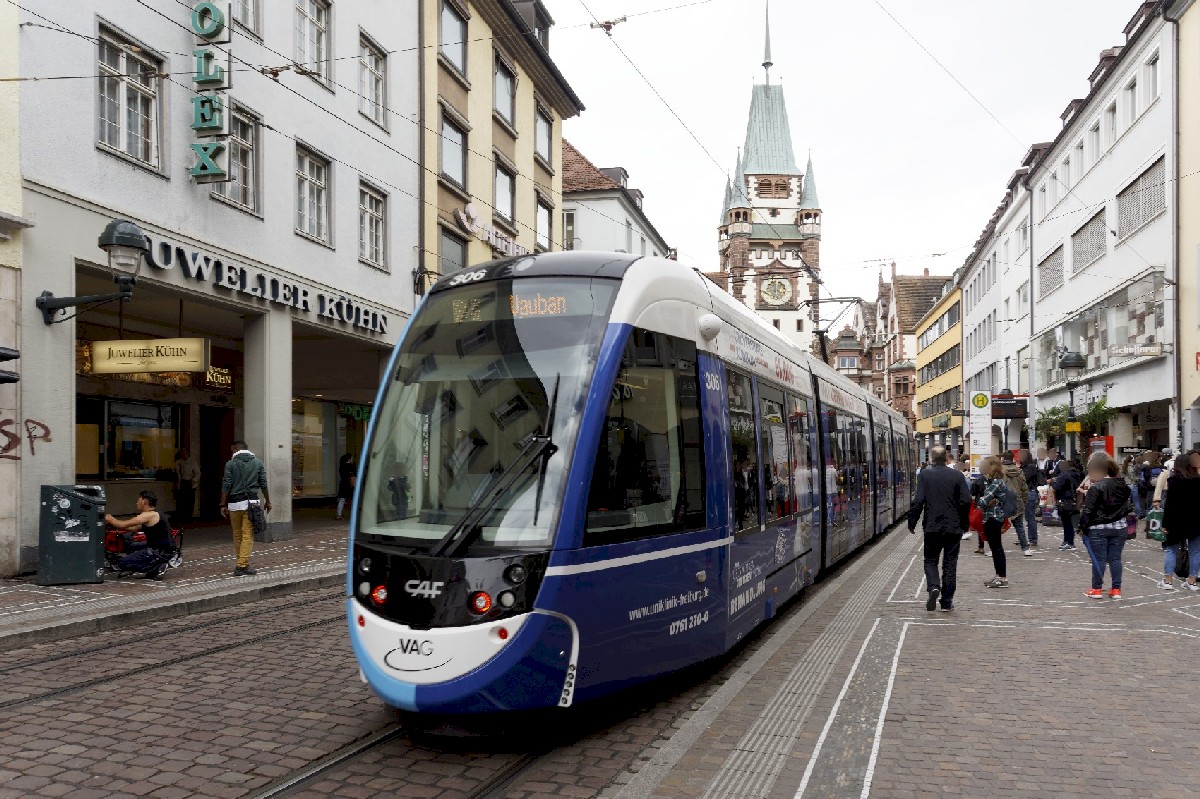 La rame 306 Urbos 3 CAF, opérant sur la ligne 3, est photographiée sur Kaiser-Joseph-Strasse à Freiburg im Breisgau, en direction du quartier Vauban, le jeudi 16 juin 2016. Copyright : Yvon Brument