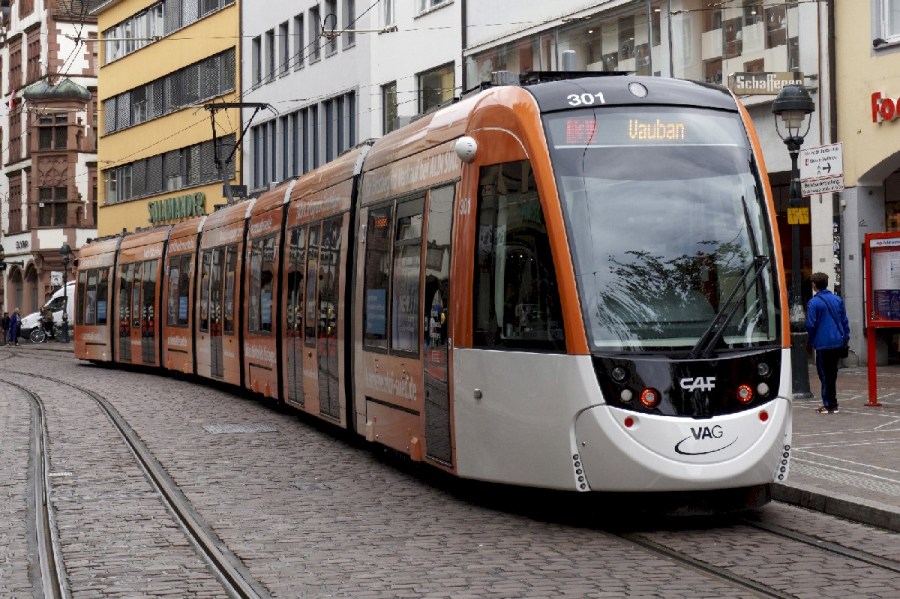 La rame 301 Urbos 3 CAF, opérant sur la ligne 3, est photographiée sur Kaiser-Joseph-Strasse à Freiburg im Breisgau, en direction du quartier Vauban, le jeudi 16 juin 2016. Copyright : Yvon Brument