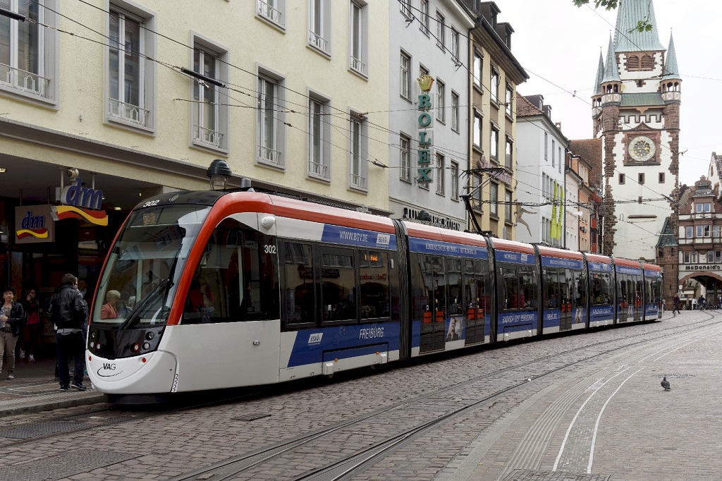La rame 302 Urbos 3 CAF, opérant sur la ligne 3, est photographiée sur Kaiser-Joseph-Strasse à Freiburg im Breisgau, le jeudi 16 juin 2016. Copyright : Yvon Brument