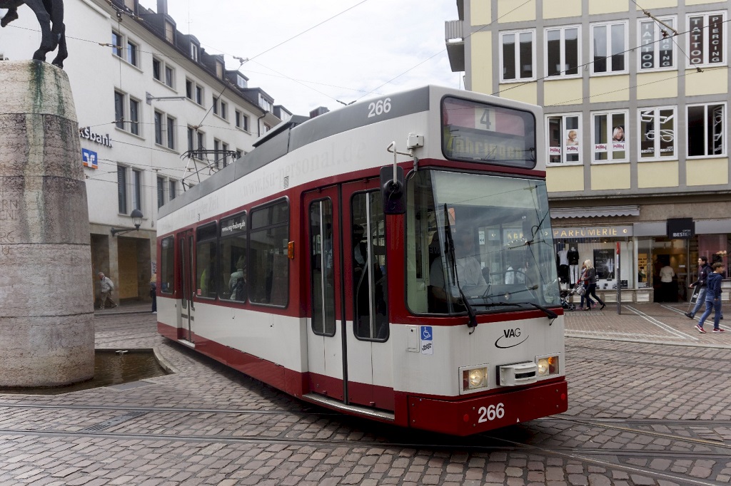 La rame 266 GT8Z Duewag, opérant sur la ligne 4, est photographiée sur le carrefour des cinq lignes de tramway de la fontaine de Bertold (Bertoldsbrunnen) à Freiburg im Breisgau, le jeudi 16 juin 2016. Copyright : Yvon Brument