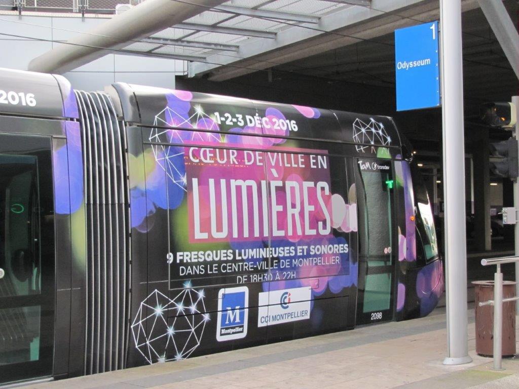 Photographie d’une motrice de la rame 2098 Citadis 402 Alstom multiligne « Cœur de Ville en Lumières », au terminus « Odysseum » de la ligne 1, le samedi 26 novembre 2016. Copyright : Edouard Paris
