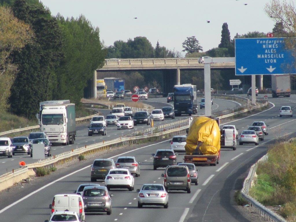 A compter du mois de juin 2017, l’essentiel du trafic des poids lourds entre Vendargues et Saint-Jean-de-Védas de l’actuelle autoroute A9 (photo) se reportera sur la nouvelle section d’autoroute A9 à péage entre Baillargues et Saint-Jean-de-Védas. Photo prise le samedi 26 novembre 2016. Copyright : Edouard Paris