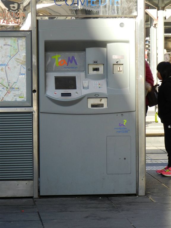 Aucun autocollant d’avertissement apposé sur le troisième distributeur de titres de transport de la station « Comédie », le mercredi 30 novembre 2016 en milieu de matinée. Copyright : Anje34