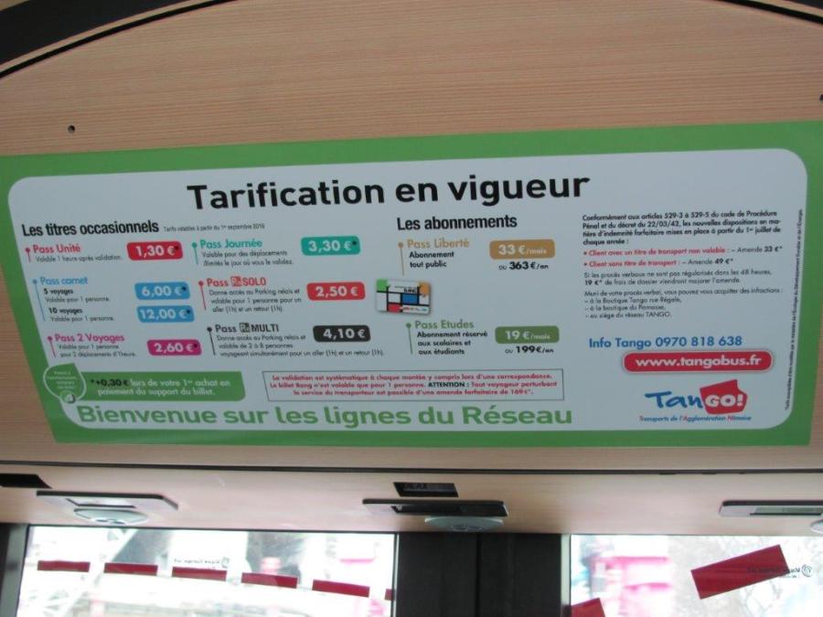 Tarification Tango! à Nîmes, en vigueur au 3 décembre 2016, photographiée le même jour à bord du BHNS 708 Crealis Neo 18 Irisbus. Copyright : Edouard Paris