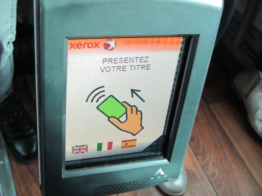 Valideur sans contact photographié à bord du BHNS 708 Crealis Neo 18 Irisbus de la ligne T1 Tango +, le samedi 3 décembre 2016. Copyright : Edouard Paris