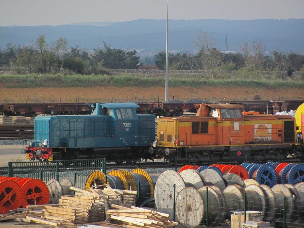 Locomotive diesel belge de la série 73 à gauche et locomotive diesel allemande V 100 à droite photographiées sur la base travaux des équipements ferroviaires de Générac, le samedi 3 décembre 2016. Copyright : Edouard Paris