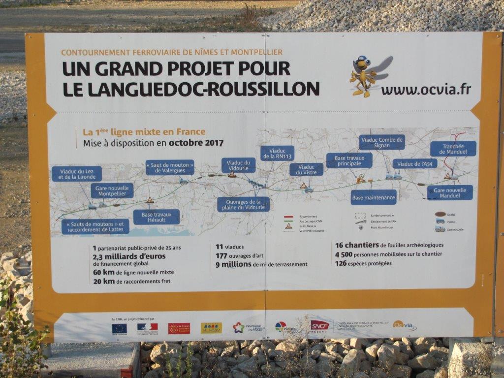 Panneau de présentation du tracé du contournement ferroviaire de Nîmes et Montpellier (CNM) et ses raccordements photographié sur la rive gauche du Vidourle, le samedi 3 décembre 2016. Copyright : Edouard Paris