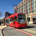 - A Washington, D.C., la rame 102 de type 12 Trio Inekon Trams quitte la station « H Street et 3rd Street », le mardi 1er mars 2016. Copyright : Karine D